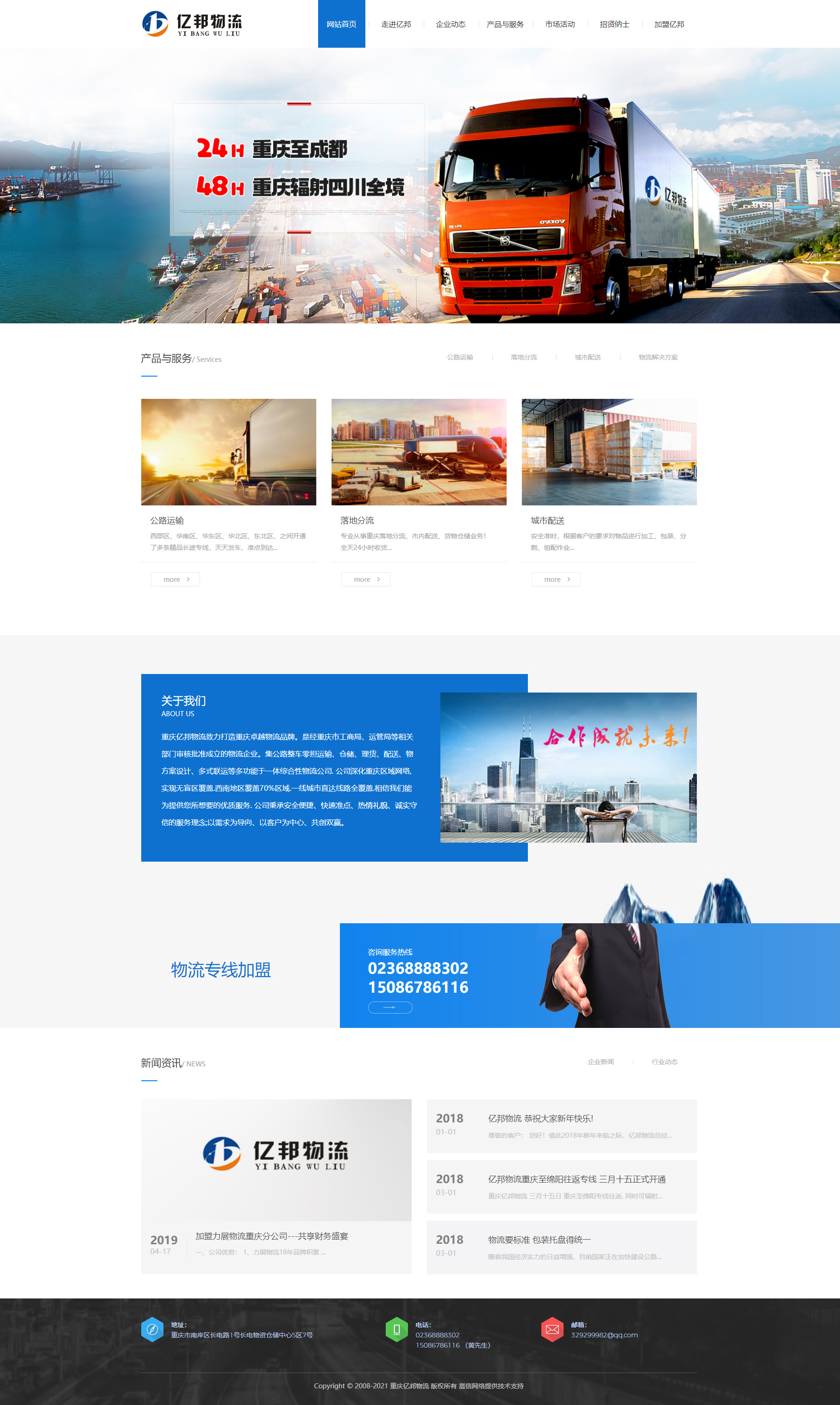 重庆亿邦物流致力打造重庆卓越物流品牌。是经重庆市工商局、运管局等相关部门审核批准成立的物流企业。集公路整车零担运输、仓储、理货、配送、物方案设计、多式联运等多功能于一体综合性物流公司. 公司深化重庆区域网络,实现无盲区覆盖.西南地区覆盖70%区域.一线城市直达线路全覆盖. 重庆至成都专线往返